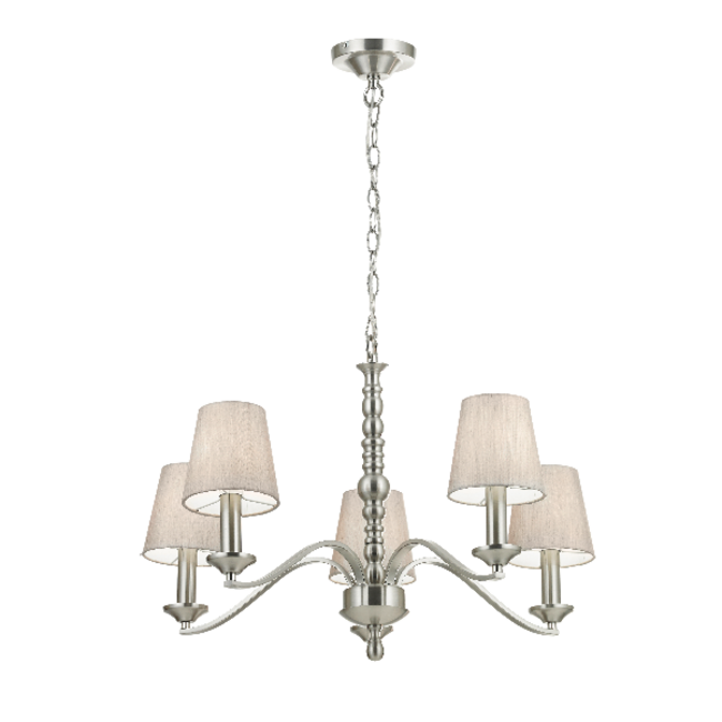 A 5 light ceiling fitting finished in satin nickel and complimented by natural cotton shades. Height is adjustable at time of fitting with a drop of up to 1520mm. It is both dimmable and suitable for use with LED lamps. Matching items and other colour opt