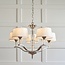 The Fiennes 5 light fitting finished in chrome effect with crystal detailing and white fabric shades. This fitting has a adjustable drop, is dimmable and suitable for use with LED lamps. Matching wall and table lamp also available