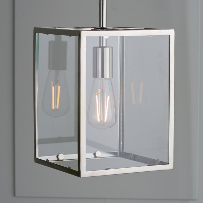 Authentic and timeless, inspired by box lanterns, the Hadden ceiling pendant is the perfect compliment for today's relaxed classic interiors. Finished in bright nickel and suspended from height adjustable chain with black fabric flex. Pair with vintage st